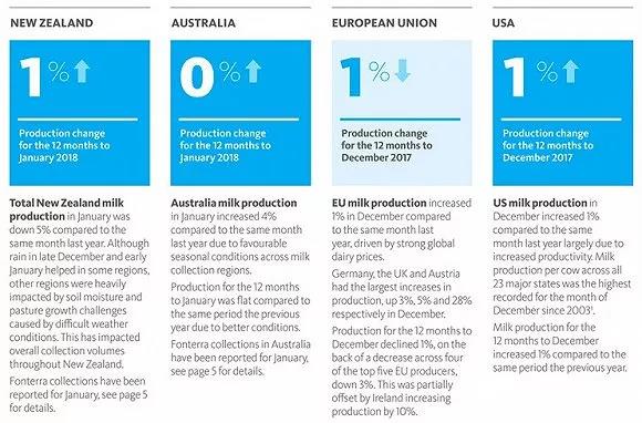 最近,恒天然(Fonterra)在其官網(wǎng)上披露了2018年2月最新財務(wù)數(shù)據(jù),公司今年1月國內(nèi)牛奶產(chǎn)量同比下降5%,原因是“糟糕的天氣狀況導(dǎo)致土壤濕度不夠,進一步影響了牧草生長和奶牛產(chǎn)奶”。